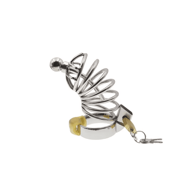 Experience the ultimate in control and restraint with our Stainless Steel Male Chastity Cage. Designed for long-term wear and secure fit, this high-quality male chastity device features a durable spiral design, a secure locking system, and a comfortable base ring with a padlock and key for complete control.