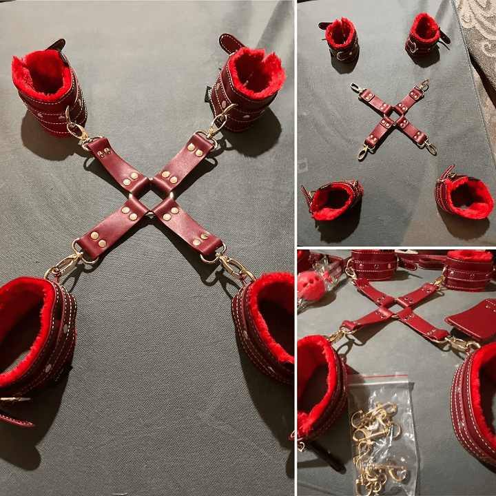 • Wrist and Ankle Cuffs – Four padded, adjustable cuffs with gold-toned hardware and connectors.