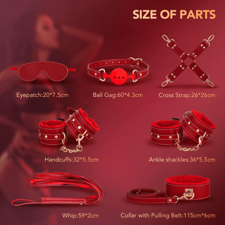 All items are coordinated in luxurious red PU leather with gold hardware, creating a cohesive and visually striking aesthetic. Ideal for couples exploring kink, roleplay, or bondage.
