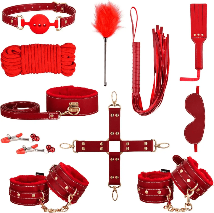 A premium 11-piece red BDSM kit displayed neatly on a white background. The set includes: